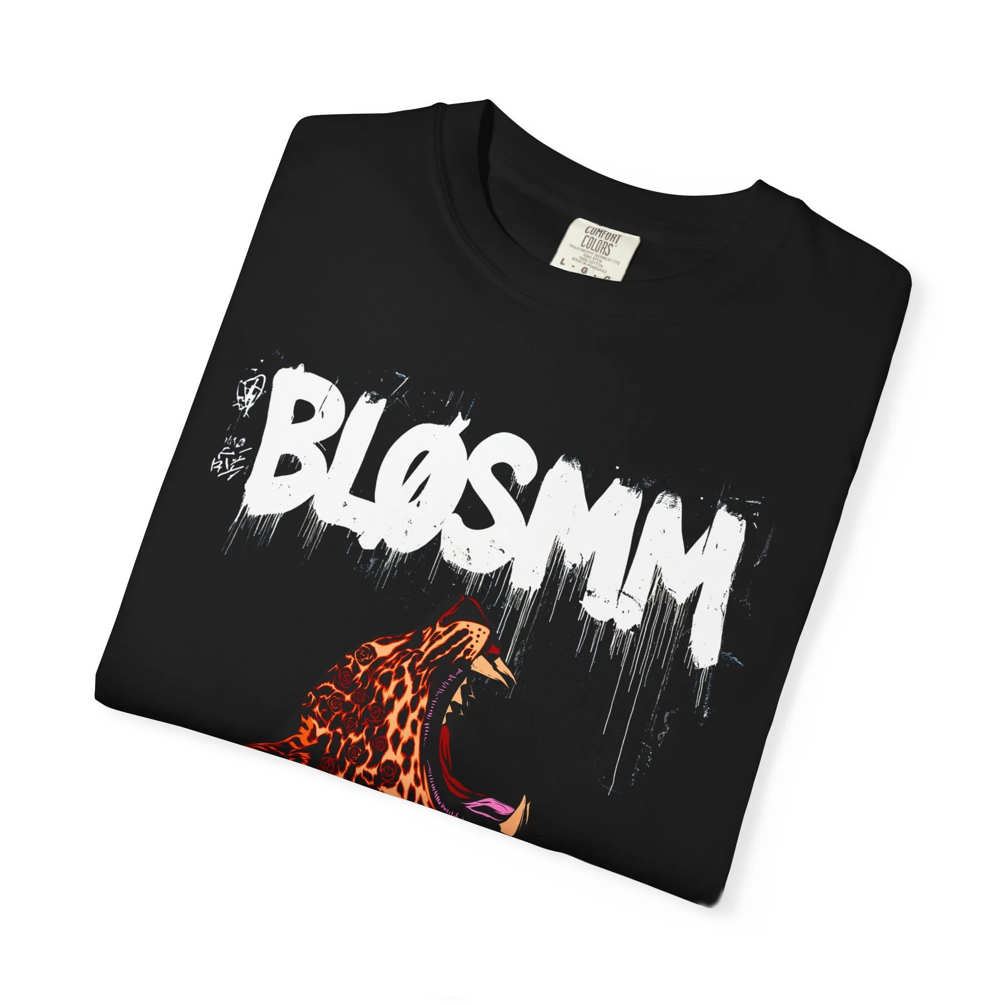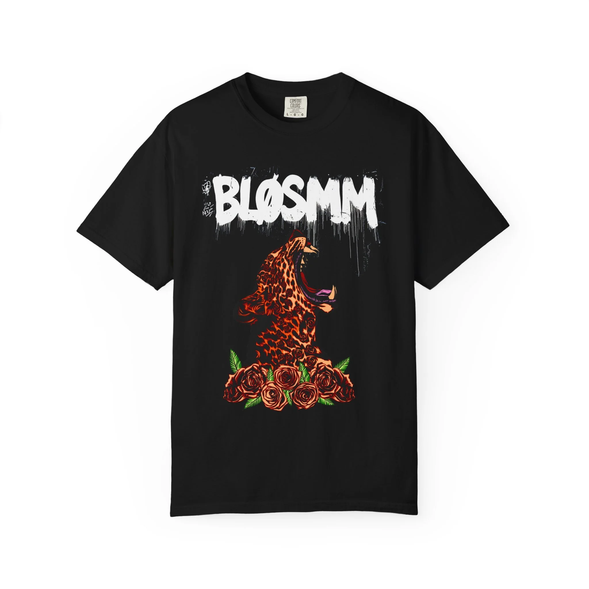 This heavyweight garment-dyed tee blends grunge energy with floral grit. A roaring, textured feline silhouette rises above a spray of deep red roses, while distressed, graffiti-style lettering drips across the chest — a look that feels lived-in from the moment you put it on. The soft, broken-in dye and relaxed cut make it a go-to layer for street shows, late-night hangs, or days when you want attitude without fuss. It sits comfortably over jeans or layered under a worn jacket, carrying a mood that’s equal parts fierce and nostalgic.